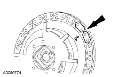Position the timing chain on the camshaft phaser and sprocket with the timing mark positioned between the 2 copper (marked) chain links.