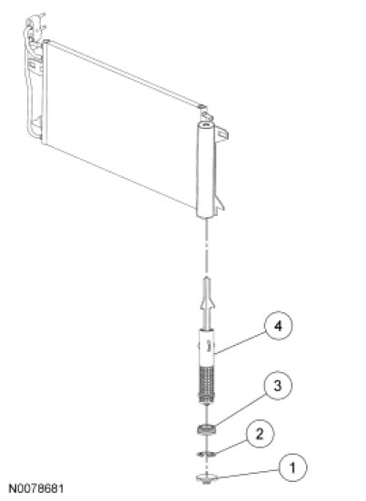 NOTE: Installation of a new receiver/drier desiccant cartridge is not required when repairing the A/C system, except when there is physical evidence of contamination from a failed A/C compressor or damage to the receiver/drier desiccant cartridge. Damage to the receiver/drier desiccant cartridge includes physical damage to the receiver/drier desiccant cartridge or moisture contamination. Moisture contamination results only from a complete loss of refrigerant and equalization of the refrigerant system pressure with atmospheric pressure for a period longer than one hour. If even a slight amount of positive refrigerant pressure is present in the system before repairs are carried out, the receiver/drier desiccant cartridge should not be replaced.