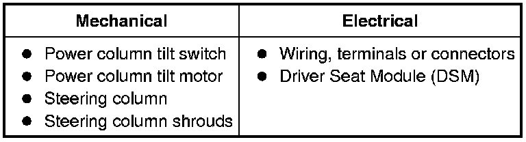 9. If the DTCs retrieved are related to the concern, go to Driver Seat Module (DSM) DTC Chart Steering Column. For all other DTCs, refer to the Master DTC Chart in Multifunction Electronic Modules Diagnostic Trouble Code (DTC) Chart.