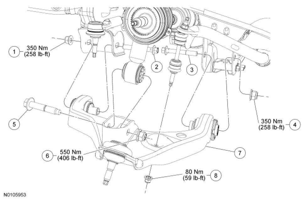 7. Tighten the lower arm forward nut to 350 Nm (258 lb-ft).