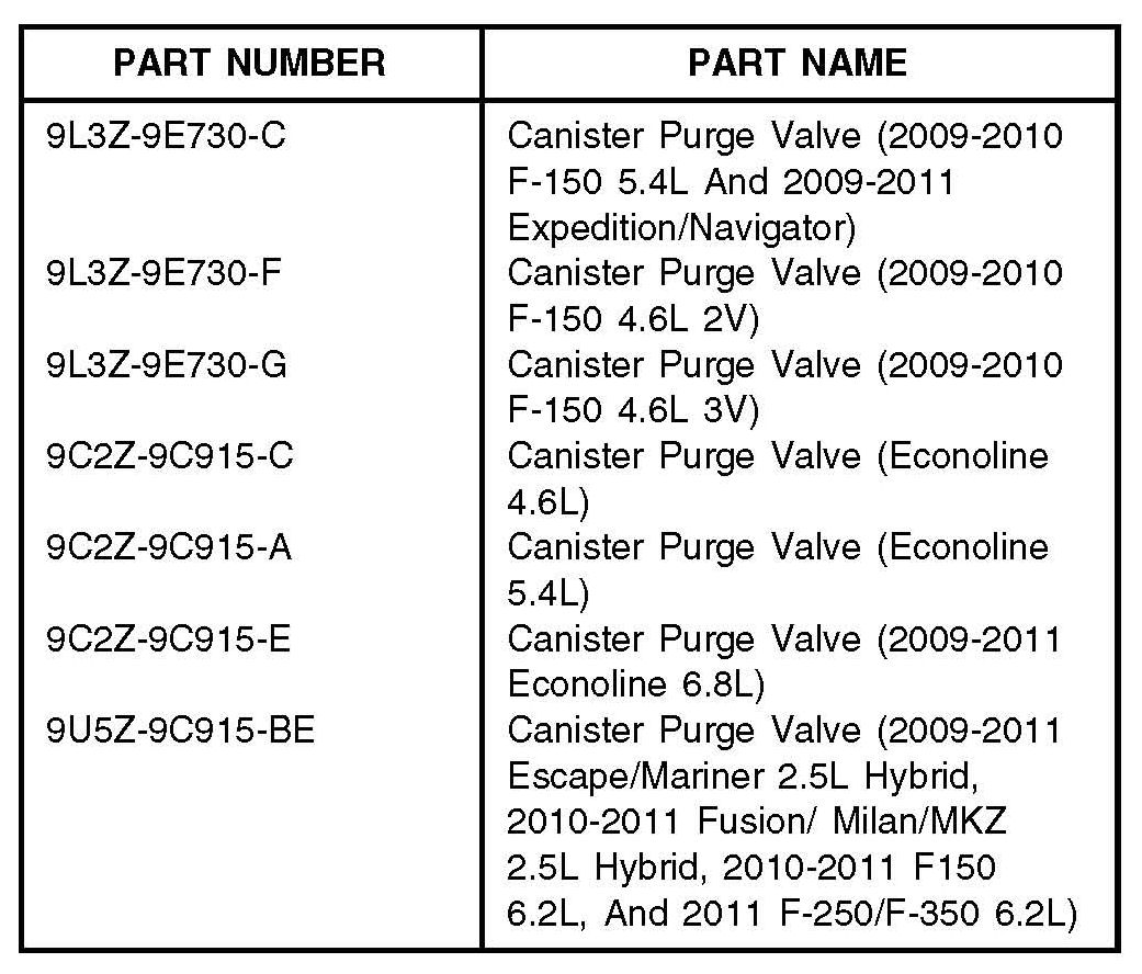 Some 2009-2010 F-150, 2009-2011 Expedition, Navigator, E-Series, Escape Hybrid, Mariner Hybrid, 2010-2011 Fusion Hybrid, Milan Hybrid, 2011 MKZ Hybrid and F-Super Duty 250/350 equipped with a 6.2L engine and built on or before 11/1/2010, may exhibit a running rough concern, hard start after refueling, audible clicking noise under the hood and/or diagnostic trouble codes (DTCs) P0171, P0174, P0316, P0442, P0455, P0456, P0457, P144A, P1450. Escape, Mariner, Fusion, Milan and MKZ Hybrid vehicles may also exhibit P1AOC.