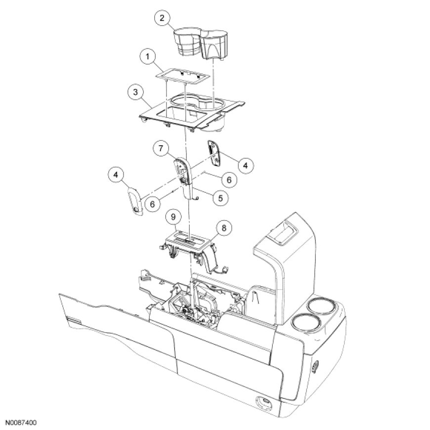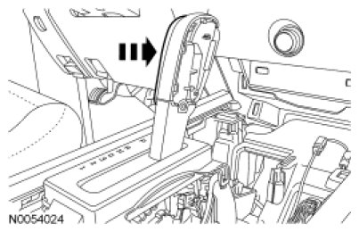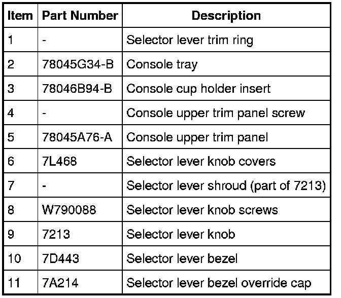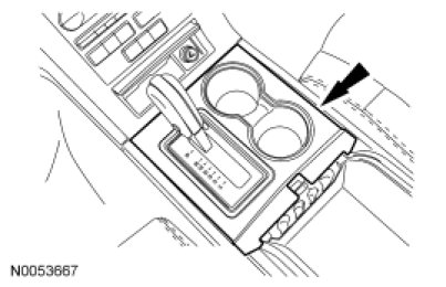 1. Remove the selector lever trim ring, console tray and cup holder insert.