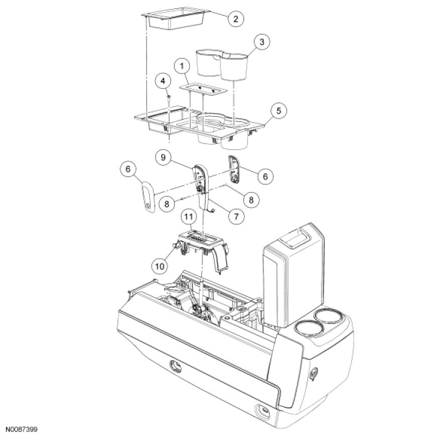 9. Install the selector lever trim ring, console tray and cup holder insert.