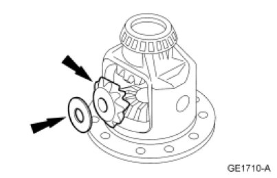 6. Remove the differential side gears and the differential side gear thrust washers.