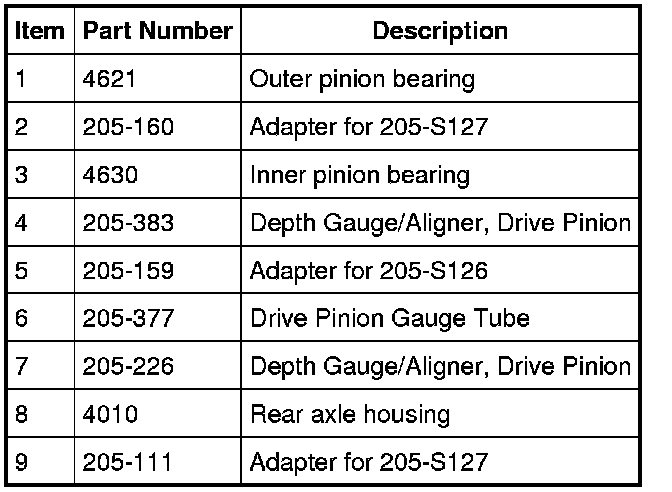Install the pinion bearings and Drive Pinion Depth Gauge/Aligner, Drive Pinion Gauge Tube, Drive Pinion Depth Gauge/Aligner and Adapters as shown.