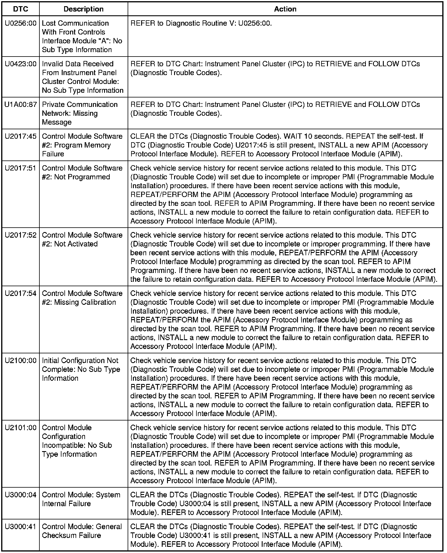 APIM (Accessory Protocol Interface Module) DTC Chart