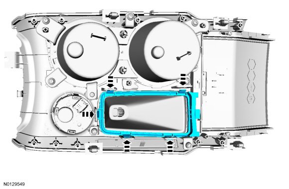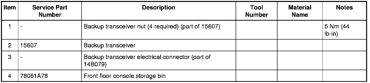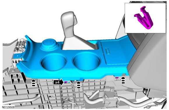 14. Release the 4 clips and pull up on the front of the front floor console storage bin to gain access to the backup transceiver.