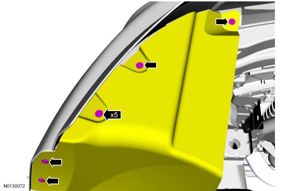 Remove the 5 screws and position aside the front fender splash shield.