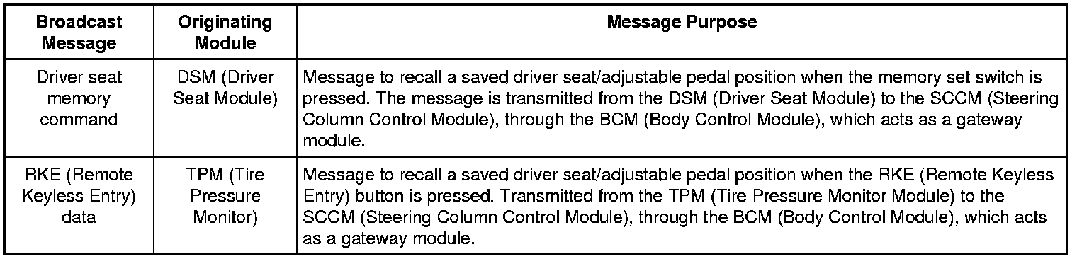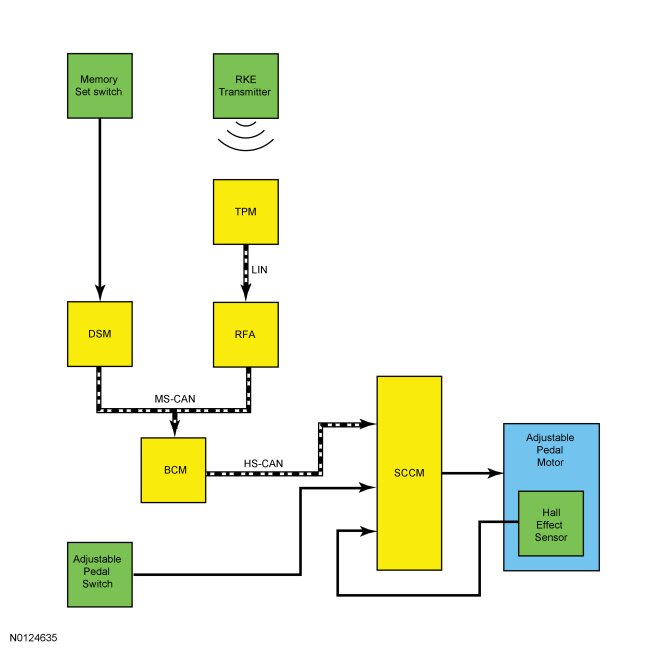 When 1 of the 3 memory set positions is recalled by pressing the memory set switch (part of the drivers side door lock control switch), the DSM (Driver Seat Module) senses continuity to ground on the memory set switch circuit and sends a message to adjust the pedal position over the MS-CAN (Medium Speed Controller Area Network) to the BCM (Body Control Module). The BCM (Body Control Module) acts as a gateway module and transmits the message over the HS-CAN (High Speed Controller Area Network) to the SCCM (Steering Column Control Module). The SCCM (Steering Column Control Module) then provides voltage to the adjustable pedal motor to move the pedals. The SCCM (Steering Column Control Module) monitors the Hall-effect sensor in the adjustable pedal motor and stops sending voltage to the motor when the required pedal position is reached. If the SCCM (Steering Column Control Module) receives a pedal position input from the pedal adjust switch during a memory position recall, the module stops the memory recall and responds to the new pedal position input.For information on setting and recalling a memory pedal position, REFER to Memory Position Programming Programming and Relearning.