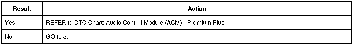 If a speaker circuit fault DTC (Diagnostic Trouble Code) is set in the ACM (Audio Control Module), the cause of the concern is a short to ground or short to voltage in an individual speaker circuit, which has caused the ACM (Audio Control Module) overload protection to activate. If a speaker circuit fault DTC (Diagnostic Trouble Code) is present, REFER to DTC Chart: Audio Control Module (ACM) - Premium Plus DTC Chart: Audio Control Module (ACM) - Premium Plus.
