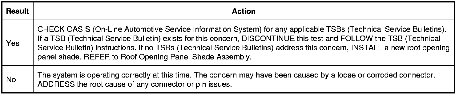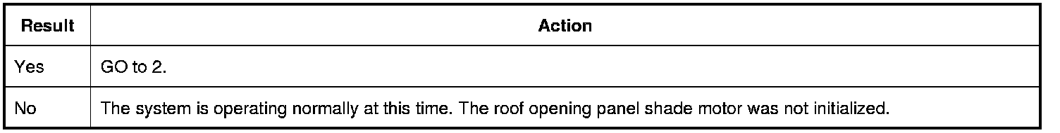 1. Carry out the roof opening panel shade motor initialization procedure. REFER to Roof Opening Panel Motor Initialization - Shade Roof Opening Panel Motor Initialization - Shade.