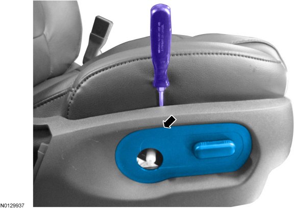 4. Insert a flat-blade screwdriver between the seat cushion and cushion side shield and release the upper front retaining tab, while pulling the rear seat control switch bezel outward.