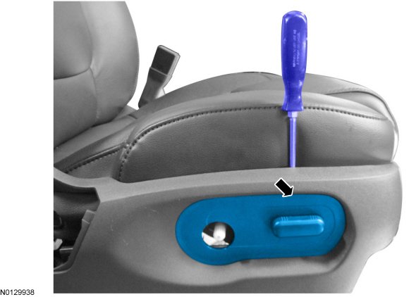 2. Insert a flat-blade screwdriver between the seat cushion and cushion side shield and release the rear retaining tab, while pulling the rear seat control switch bezel outward.