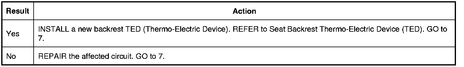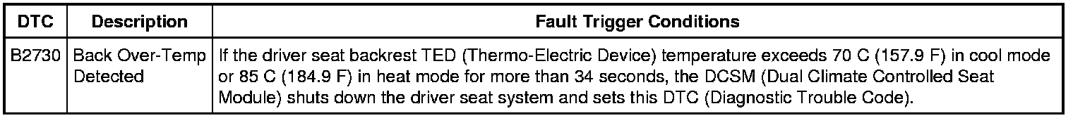 3. Operate the driver seat in high heat or high cool and monitor the seat operation. If a circuit fault is present, the DCSM (Dual Climate Controlled Seat Module) disables the seat.