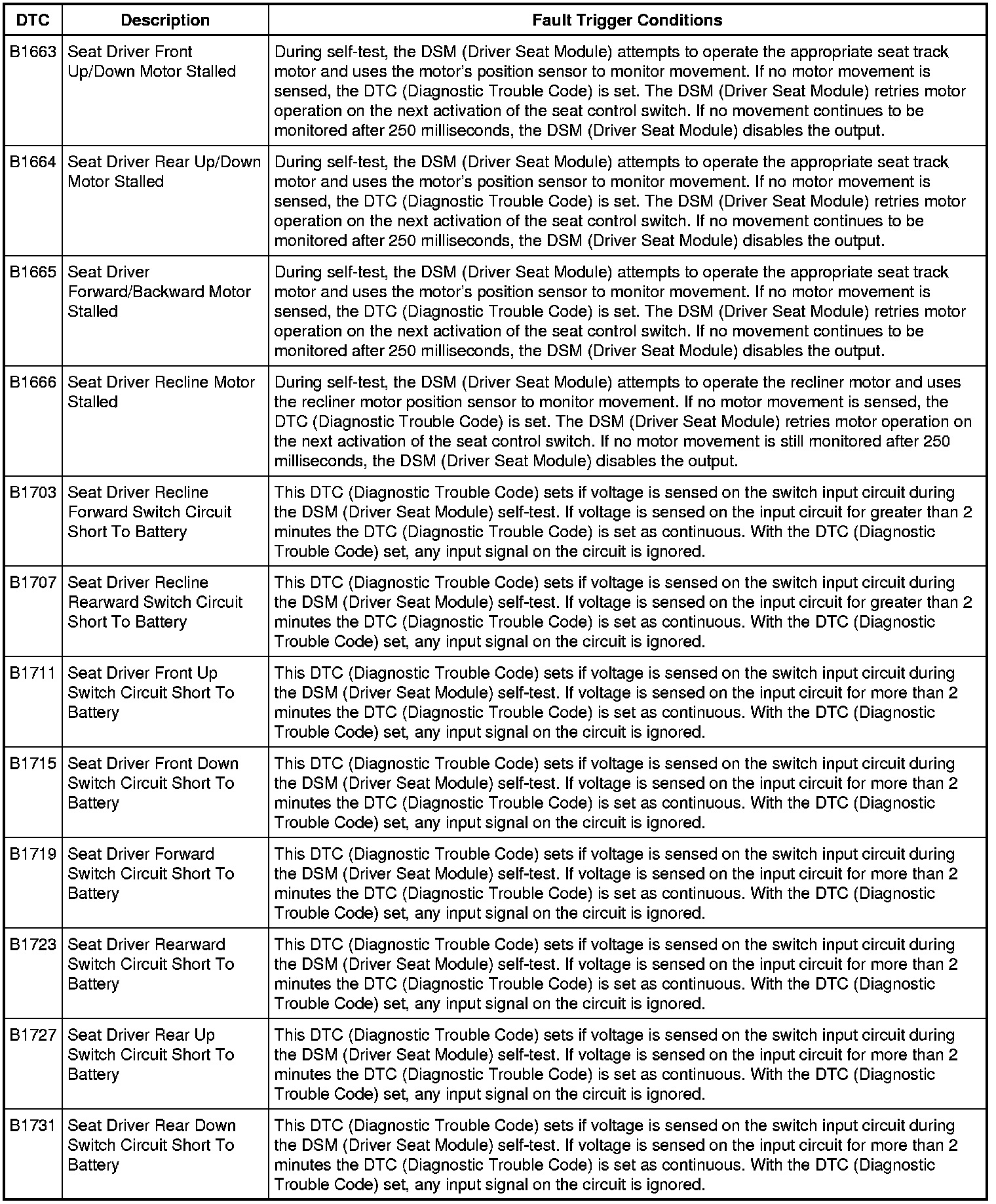 The seat control switch supplies voltage and ground to the applicable DSM (Driver Seat Module) inputs. The DSM (Driver Seat Module) then supplies voltage and ground to the appropriate seat track motor or seat recliner motor to move the seat in the desired direction. There are 3 seat track motors that combine to move the seat horizontally (forward/backward) and vertically (front up/down and rear up/down). The seat recliner mechanism uses a single motor to pivot the seat backrest forward and backward.