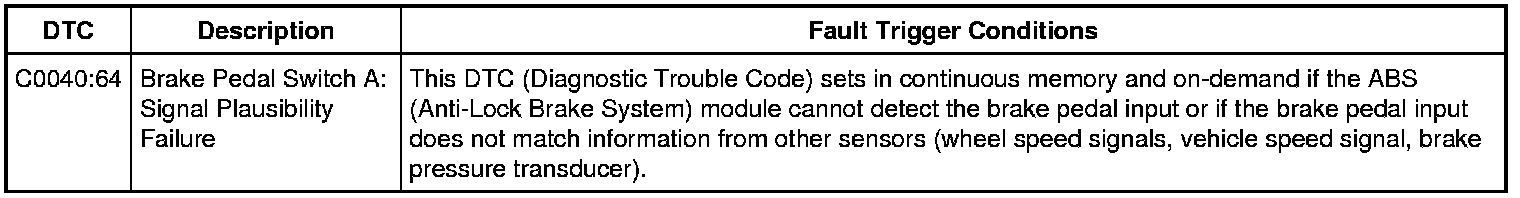 The ABS (Anti-Lock Brake System) module receives brake pedal switch input from the PCM (Powertrain Control Module) over the HS-CAN (High Speed Controller Area Network). The ABS (Anti-Lock Brake System) module compares this information against other inputs (wheel speed signals, vehicle speed signal, brake pressure input) to determine if the brake pedal input is valid. A brake pedal switch that is incorrectly installed can cause a signal plausibility concern.