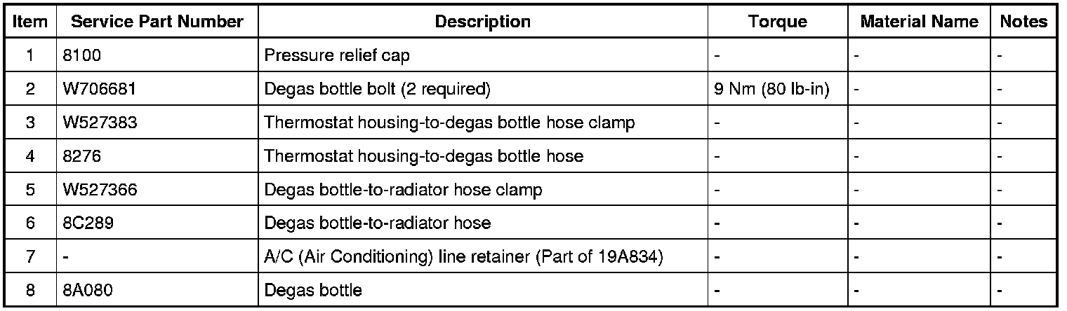 Fill the degas bottle to the cold fill range with a 50/50 mixture of Motorcraft(R) Specialty Green Engine Coolant and distilled water.