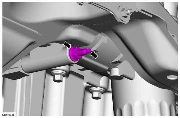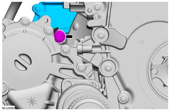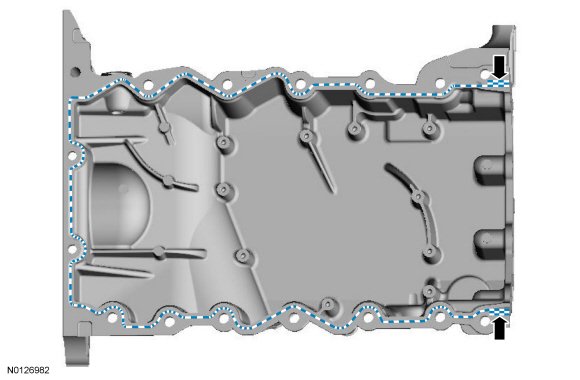 1. Apply a 5.5 mm (0.22 in) bead of Motorcraft(R) High Performance Engine RTV Silicone to the 2 engine front cover-to-cylinder block joint areas on the sealing surface of the oil pan.