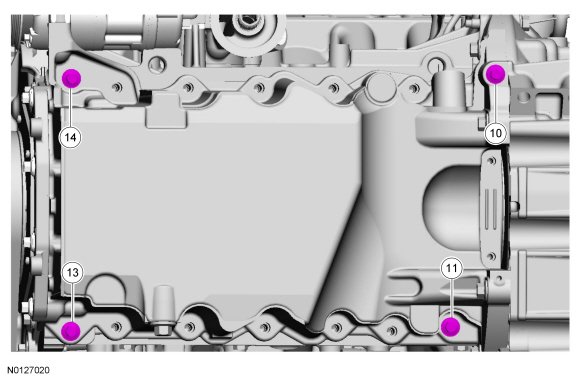 Install the oil pan and bolts 10, 11, 13 and 14 finger tight.