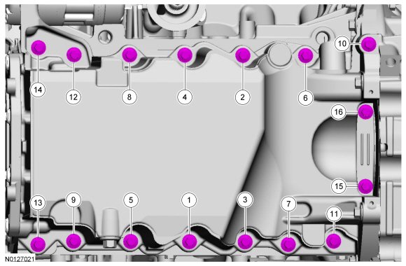 11. Install the remaining oil pan bolts and tighten in the sequence shown.