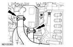 67. Remove the 2 secondary latches from the transmission fluid cooler tubes at the transmission fluid cooler thermal bypass valve.