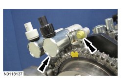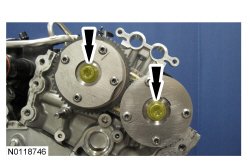 23. NOTE: The 2 VCT (Variable Camshaft Timing) oil control solenoids are removed for clarity.