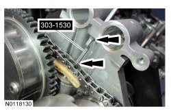 14. Assemble the 2 LH (Left Hand) VCT (Variable Camshaft Timing) assemblies and the LH (Left Hand) secondary timing chain.