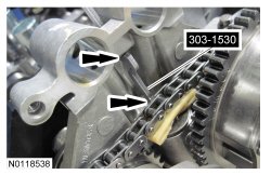 Install the primary timing chain with the colored links aligned with the timing marks on the VCT (Variable Camshaft Timing) assemblies and the crankshaft sprocket.