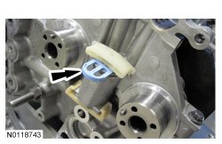 13. Remove and discard the LH (Left Hand) secondary timing chain tensioner shipping clip.