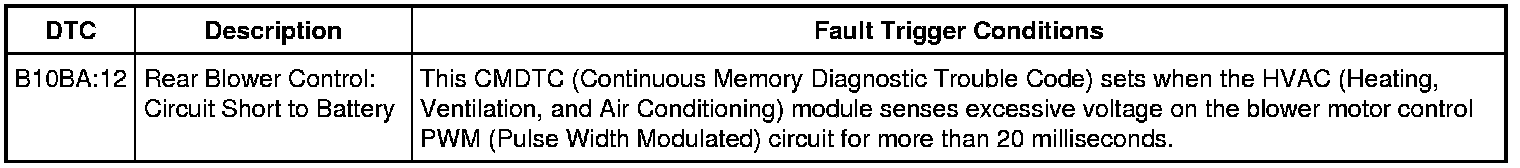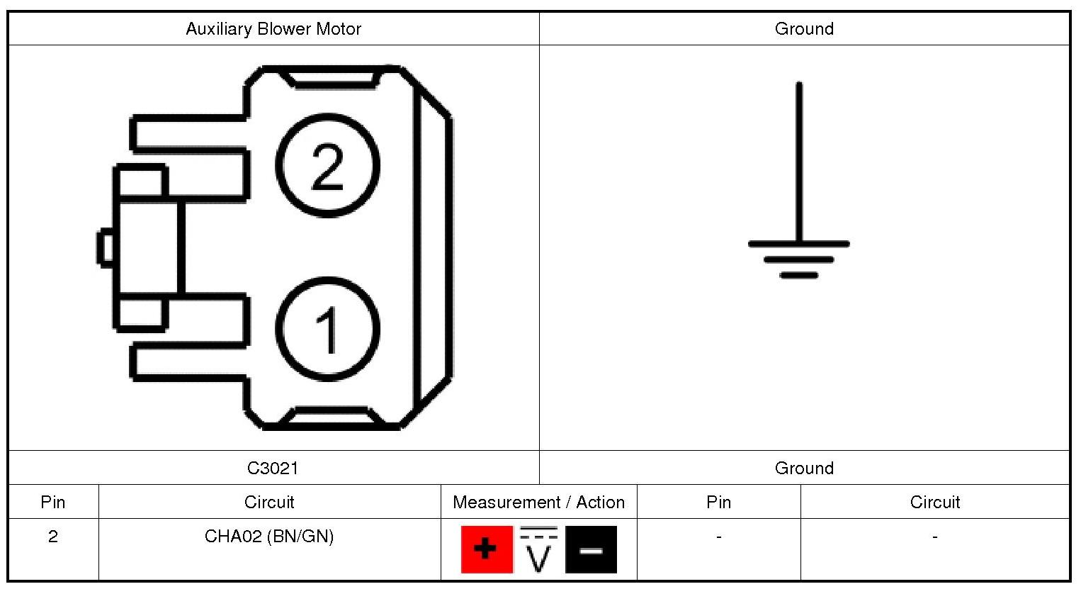 The auxiliary blower motor relay coil receives a ground from the HVAC (Heating, Ventilation, and Air Conditioning) module. When the relay coil is energized, voltage is delivered from the relay to the auxiliary blower motor speed control and auxiliary blower motor. The auxiliary blower motor speed control is grounded. The HVAC (Heating, Ventilation, and Air Conditioning) module provides a PWM (Pulse Width Modulated) signal to the auxiliary blower motor speed control to control the blower speed. Ground for the motor is provided from the auxiliary blower motor speed control.