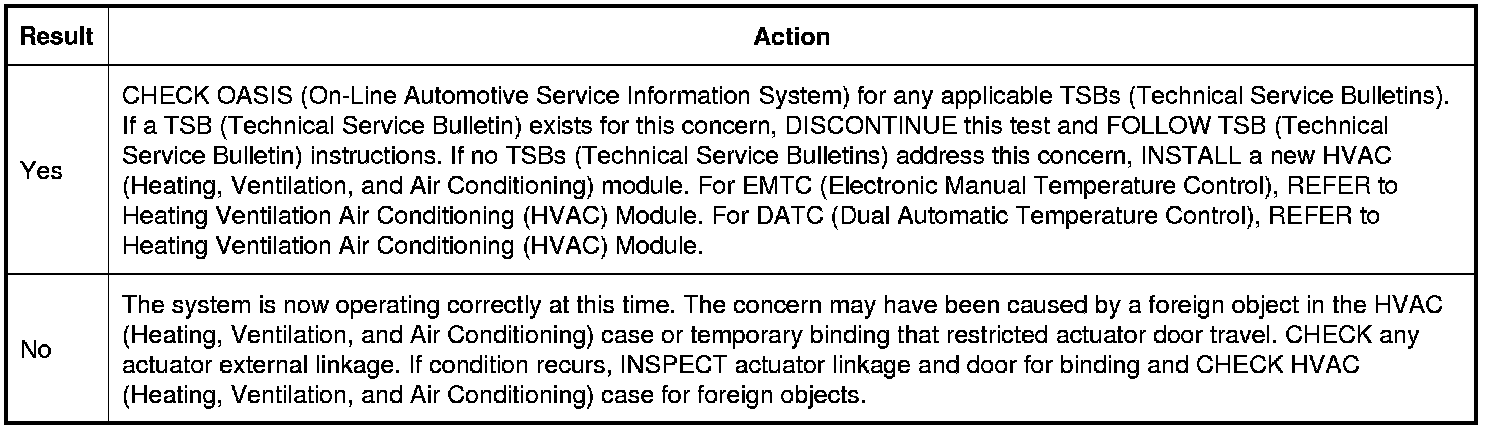 During an actuator calibration cycle, the HVAC (Heating, Ventilation, and Air Conditioning) module drives the auxiliary mode door until the door reaches both internal stops in the HVAC (Heating, Ventilation, and Air Conditioning) case. If the auxiliary mode door is temporarily obstructed or binding during a calibration cycle, the HVAC (Heating, Ventilation, and Air Conditioning) module may interpret this as the actual end of travel for the door. When this condition occurs and the HVAC (Heating, Ventilation, and Air Conditioning) module commands the actuator to its end of travel, the airflow may not be from the expected outlets.