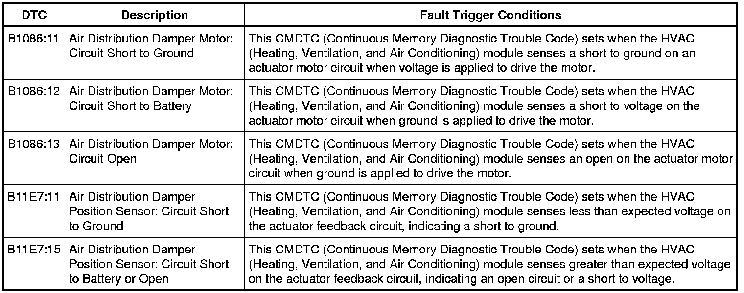 During an actuator calibration cycle, the HVAC (Heating, Ventilation, and Air Conditioning) module drives the defrost/panel/floor mode door until the door reaches both internal stops in the HVAC (Heating, Ventilation, and Air Conditioning) case. If the defrost/panel/floor mode door is temporarily obstructed or binding during a calibration cycle, the HVAC (Heating, Ventilation, and Air Conditioning) module may interpret this as the actual end of travel for the door. When this condition occurs and the HVAC (Heating, Ventilation, and Air Conditioning) module commands the actuator to its end of travel, the airflow may not be from the expected outlets.