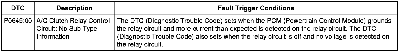 Voltage is provided to the A/C (Air Conditioning) clutch relay coil. When A/C (Air Conditioning) is requested and A/C (Air Conditioning) line pressures allow, a ground is provided to the A/C (Air Conditioning) clutch relay coil from the PCM (Powertrain Control Module), energizing the A/C (Air Conditioning) clutch relay.