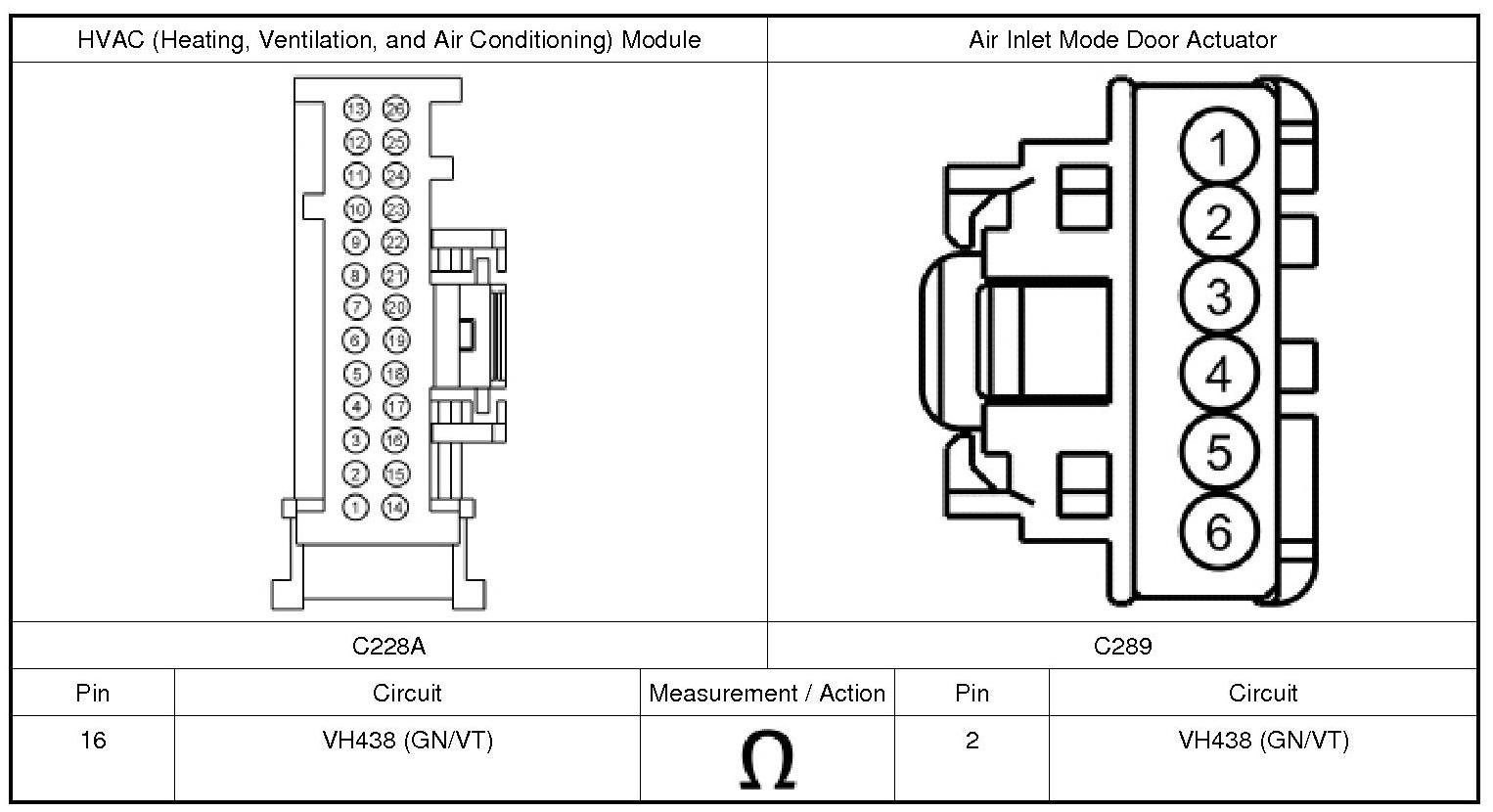 To rotate the air inlet mode door actuator, the HVAC (Heating, Ventilation, and Air Conditioning) module supplies voltage and ground to the air inlet mode door actuator through the door actuator motor circuits. To reverse the air inlet mode door actuator rotation, the HVAC (Heating, Ventilation, and Air Conditioning) module reverses the voltage and ground circuits.