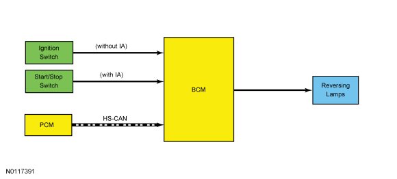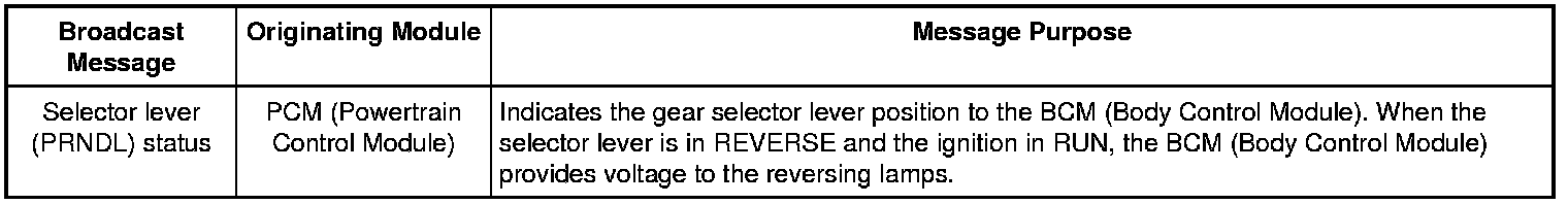 When the transmission is in REVERSE, the PCM (Powertrain Control Module) sends a selector lever (PRNDL) status message over the communication network to the BCM (Body Control Module) indicating the transmission is in reverse. The BCM (Body Control Module) provides voltage to the reversing lamps when it receives the message that the transmission is in reverse and the ignition is in RUN.