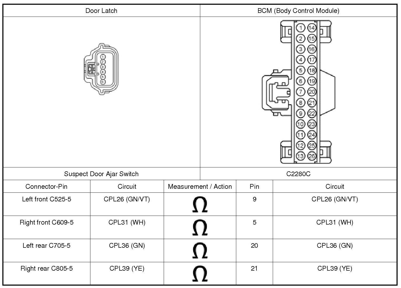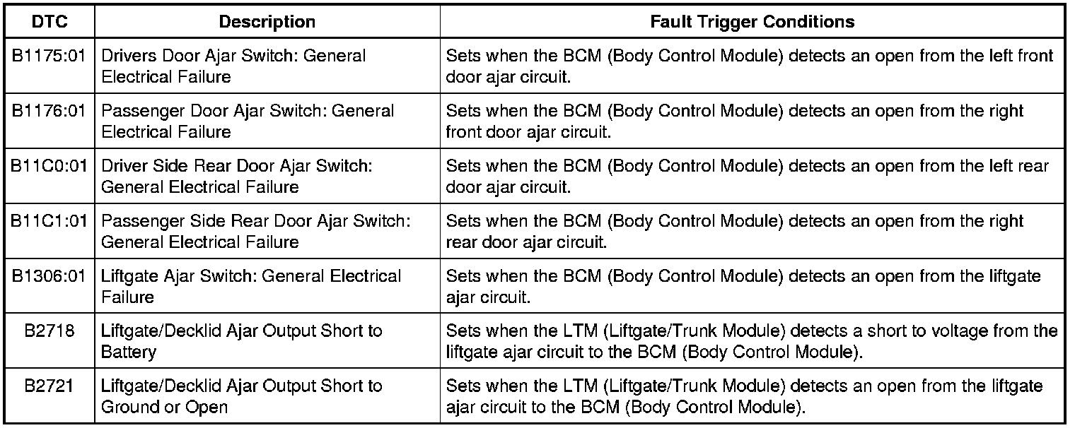 2. Monitor the BCM (Body Control Module) DOOR_SW_DRVR, DOOR_SW_PSGR, DOOR_SW_LR, DOOR_SW_RR PID (Parameter Identification).