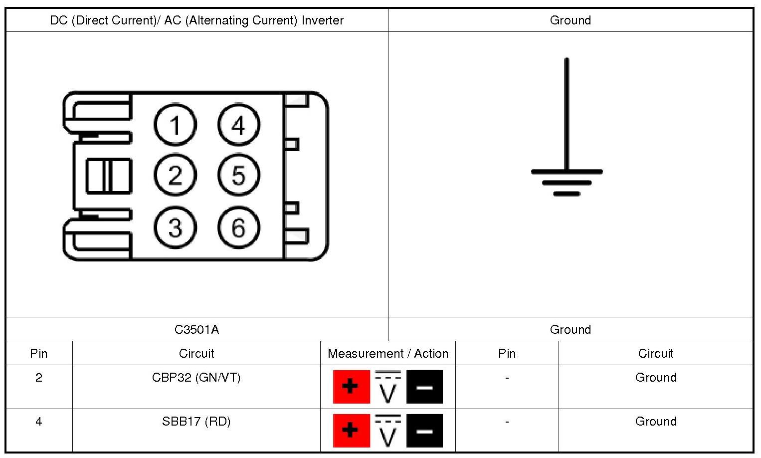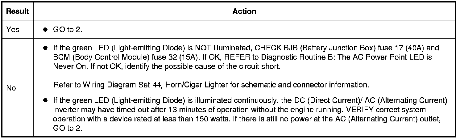 The DC (Direct Current)- AC (Alternating Current) inverter receives 12 volts DC (Direct Current) from the BJB (Battery Junction Box) and the BCM (Body Control Module) and is wired to chassis ground. Power from the BJB (Battery Junction Box) is available at all times, regardless of ignition status. Power from the BCM (Body Control Module) is available when the ignition is ON, or for up to 10 minutes after the ignition is turned OFF, as long as the front doors remain closed throughout that 10 minutes. The incoming DC (Direct Current) power is internally converted to 60 Hz 110 volts AC (Alternating Current) that is outputted to the AC (Alternating Current) outlet.