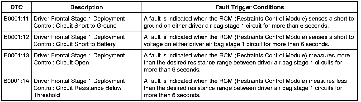 The RCM (Restraints Control Module) continuously monitors the driver air bag module stage 1 circuits for the following faults: