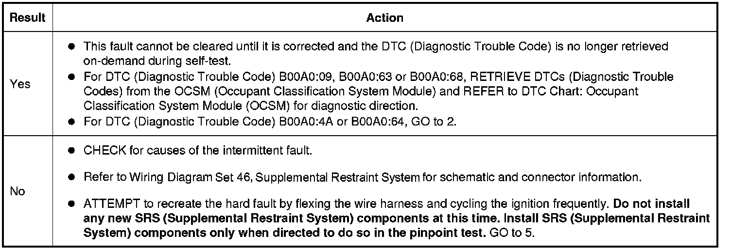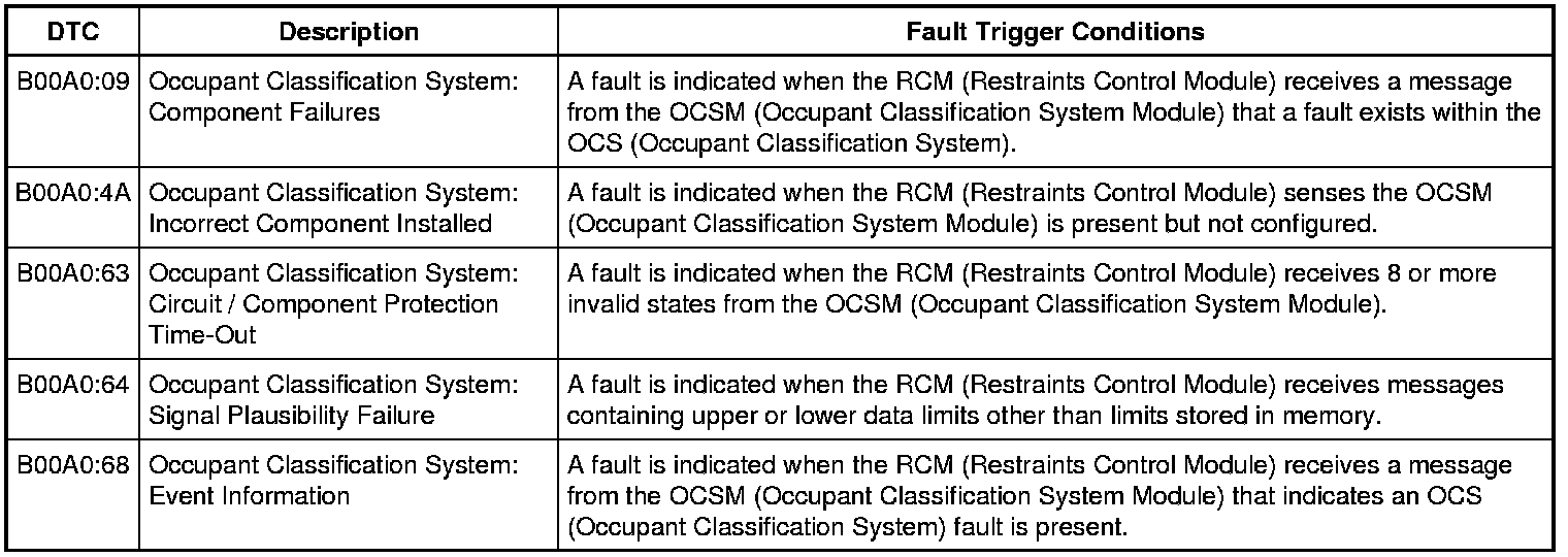 The RCM (Restraints Control Module) is in constant communication with various control modules on the HS-CAN (High Speed Controller Area Network). One of those modules is the OCSM (Occupant Classification System Module). The RCM (Restraints Control Module) continuously monitors the HS-CAN (High Speed Controller Area Network) for fault messages reported by the OCSM (Occupant Classification System Module). The RCM (Restraints Control Module) also checks for the correct identification of the OCSM (Occupant Classification System Module). If the RCM (Restraints Control Module) receives fault message(s) from the OCSM (Occupant Classification System Module) system, it stores DTC (Diagnostic Trouble Code) B00A0:09, B00A0:4A, B00A0:63, B00A0:64 or B00A0:68 in memory and sends a message to the IPC (Instrument Panel Cluster) to illuminate the air bag warning indicator.