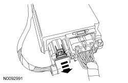 4. Disengage the lock tab, press and disconnect the RCM (Restraints Control Module) small electrical connector.