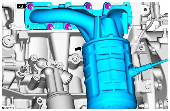 Stage 1: Tighten the 3 lower LH (Left Hand) catalytic converter manifold-to-cylinder head nuts to 25 Nm (18 lb-ft).