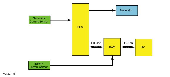 The PCM (Powertrain Control Module) reports any charging system faults and sends a message through HS-CAN (High Speed Controller Area Network) to the BCM (Body Control Module). The BCM (Body Control Module) controls the charging system warning indicator by sending a message over the MS-CAN (Medium Speed Controller Area Network) to the IPC (Instrument Panel Cluster). The IPC (Instrument Panel Cluster) then controls charging system warning indication based on the message from the PCM (Powertrain Control Module) through the BCM (Body Control Module). The status of the PCM (Powertrain Control Module) charging system warning indicator and/or message can be confirmed by viewing PCM (Powertrain Control Module) PID (Parameter Identification) generator fault indicator lamp (GENFIL). Any charging system fault detected by the PCM (Powertrain Control Module) results in 1 or more DTCs (Diagnostic Trouble Codes) being set and the PID (Parameter Identification) GENFIL having a status of On. If equipped with a charging system warning indicator, the IPC (Instrument Panel Cluster) turns the indicator on or off. If equipped with a message center, the IPC (Instrument Panel Cluster) displays a CHECK CHARGING SYSTEM message. When the ignition is ON and the engine is off on vehicles equipped with a message center, the CHECK CHARGING SYSTEM message may not be displayed.