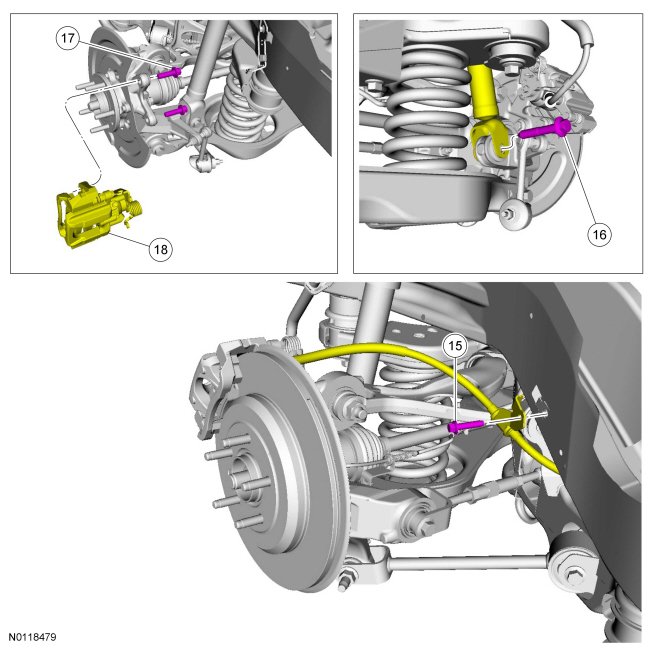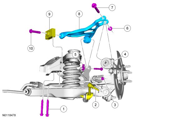 13. Remove and discard the upper arm-to-subframe forward bolt and nut.