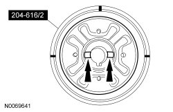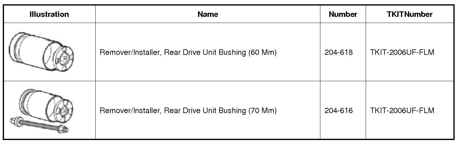 NOTE: When installing the RDU (Rear Drive Unit) bushing, RDU (Rear Drive Unit) 204-616/2 will fall away as the RDU (Rear Drive Unit) bushing is installed into the subframe. The RDU (Rear Drive Unit) 204-616 does not control the depth of the bushing. The RDU (Rear Drive Unit) bushing is fully seated when the RDU (Rear Drive Unit) 204-616/3 and RDU (Rear Drive Unit) 204-616/1 fall away from the subframe, do not continue to tighten the RDU (Rear Drive Unit) 204-616.
