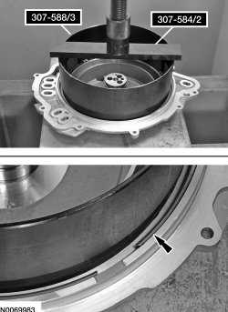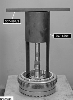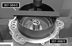 135. Using 307-584/1 and 307-584/2, compress the intermediate clutch return spring, using a press and remove the snap ring.