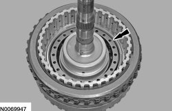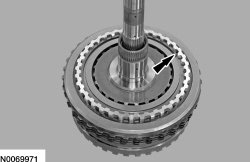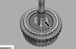 119. NOTICE: Only compress the direct clutch piston return spring far enough to install the direct clutch cylinder snap ring. If the direct clutch cylinder is pressed too far, the direct clutch cylinder alignment tab may be broken off. The tab is used to align the TSS (Turbine Shaft Speed) sensor tone wheel (part of the direct clutch cylinder). If the tab is broken, erratic shifts and transmission damage can occur.