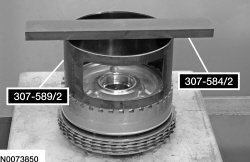 Install 307-589/2 and 307-584/2 on the direct clutch cylinder. Using a press, compress the direct clutch piston return spring and install the snap ring.