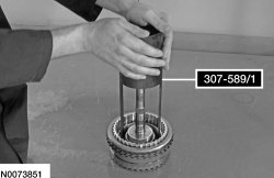 123. Install the overdrive clutch piston in the overdrive/direct clutch hub and shaft assembly and push the overdrive clutch piston in the cylinder by hand using 307-589/1.