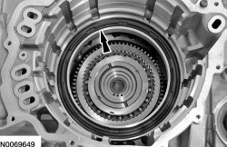 249. Measure the depth of the low/reverse clutch pressure plate where the tab fits into the gap of the low OWC (One-Way Clutch) snap ring and directly across from it. If the pressure plate is seated correctly, the depth should be the same. If the depths are different, rotate the snap ring so that the gap fits around the tab on the pressure plate.