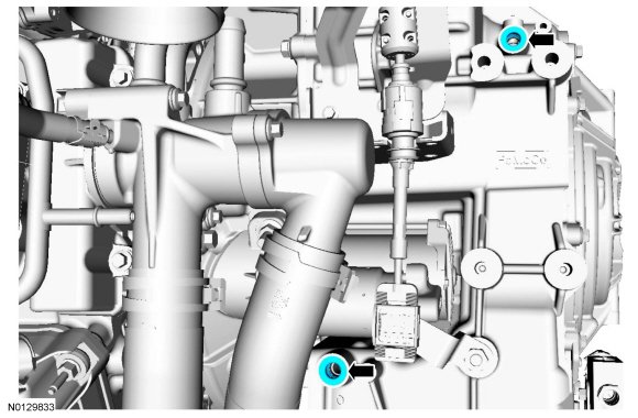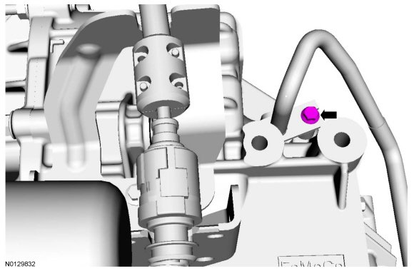 4. Remove and discard the transmission mounted transmission fluid cooler outlet tube bolt.